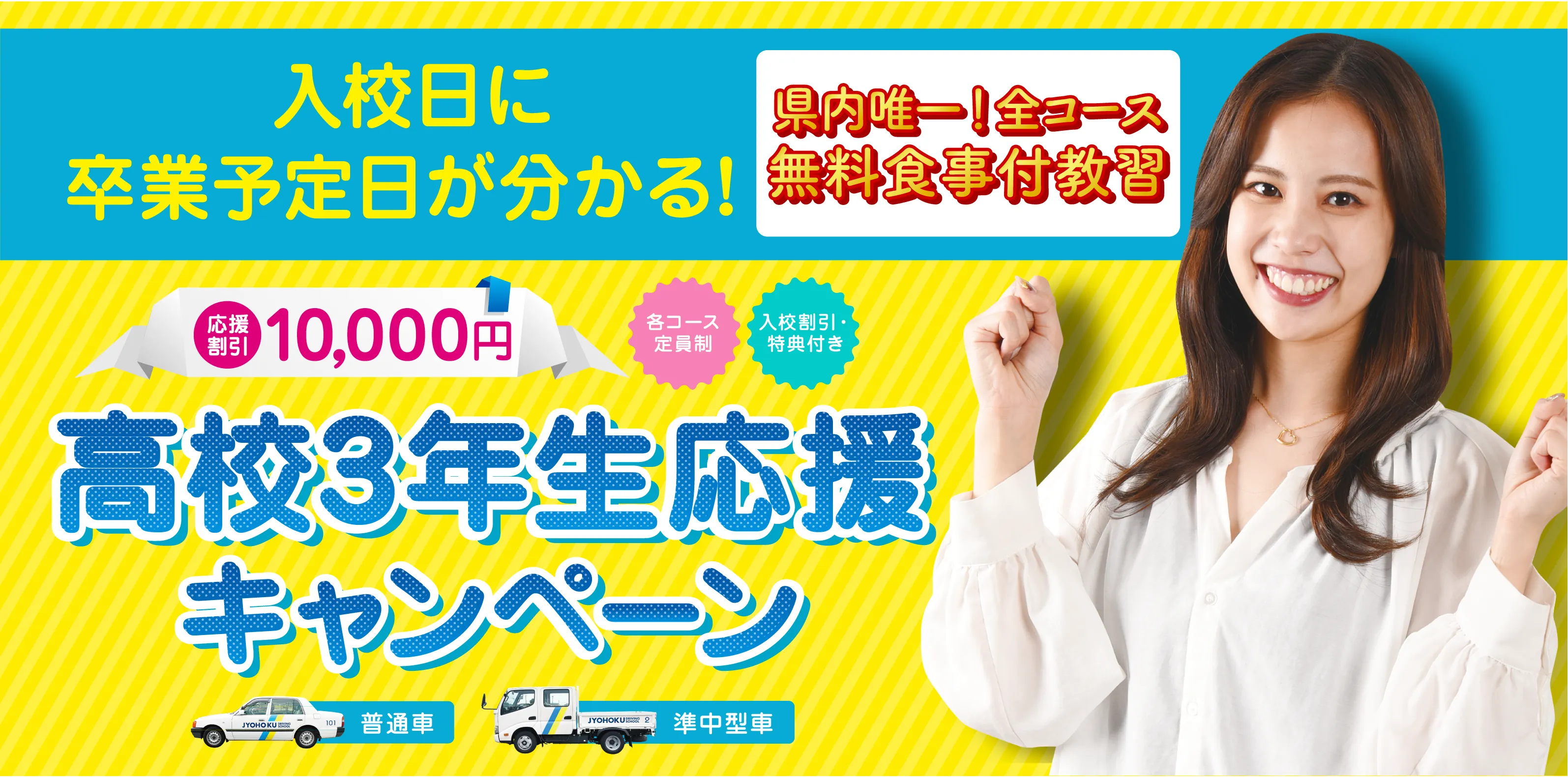 「無料食事付き教習」 教習で来校した日は無料で食事ができる! 県内唯一!全コースの教習生が対象です!